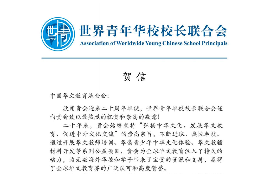 世界青年华校校长联合会的贺信