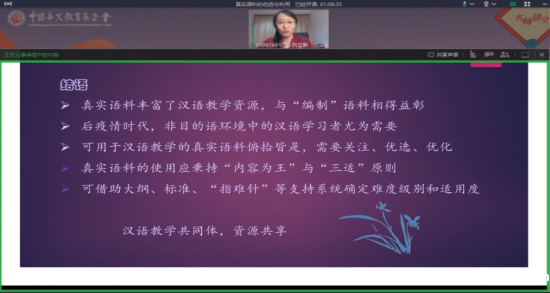刘立新副教授指出,教学资源分为纸质材料、数字化教材和真实语料,而真实语料是母语为汉语的中国人所见、所听、所说、所用的自然语料,它并非专为第二语言学习者制作。她提到,真实语料包括实物、文字、图片、音频、视频等形态,可呈现汉语情境语境和文化语境,提高教学含金量,但使用真实语料时,要注意适度、活用和兼顾。