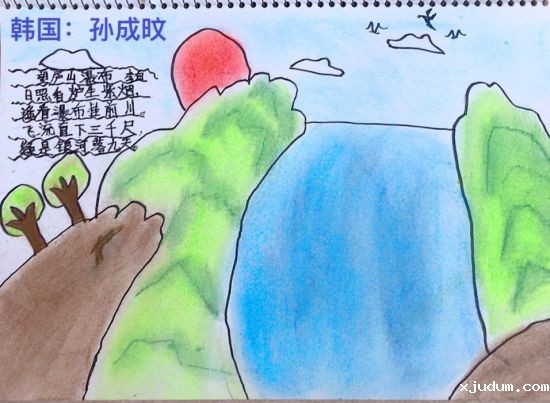 内景老师张林通过两则关于庐山的传说,介绍了庐山名称的由来,并带领大家学习了有关庐山的古诗词。内景老师还介绍了锦绣谷、含鄱口和五老峰等庐山著名景点,并和学生们分享了古诗手势舞《望庐山瀑布》。大家还和老师一起完成了手工作品《庐山诗意图》。