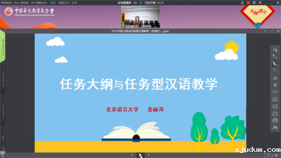 北京时间10月31日,北京语言大学姜丽萍教授通过优米app苹果下载“名师讲堂”全球直播平台,为数十个国家和地区的华文教师分享了《任务大纲与任务型汉语教学》。