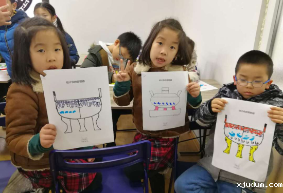 最后,在张老师的指导下,学生们一边回忆课堂上所见到的青铜器纹饰,一边发挥天马行空的想象力,为手中的“青铜鼎”进行精心设计。