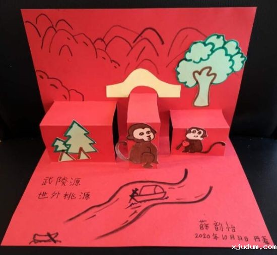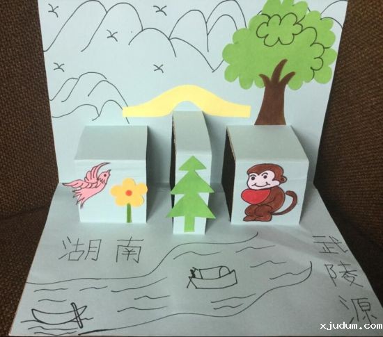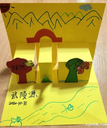 内景老师朱晨光从历史、地理、文化等方面介绍了武陵源名称的由来,并对张家界的三大奇观——“光圈、月亮、影子”做了讲解。随后,内景老师与大家分享了索溪峪风景区的黄龙洞和天子山风景区的砂岩峰林,并通过图片让学生们更加直观地了解溶洞和峰林的特色。通过讲解,学生们还了解了索溪峪景区十里画廊石峰故事,完成了手工作品“武陵源立体卡片”。