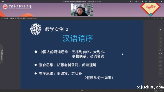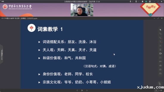 张云刚老师从词汇教学入手,梳理了在词汇中隐藏的中国传统文化知识,还通过对不同教学对象的分析,讲解了如何设计文化课程以及文化课程如何分层次、分主题教学等。