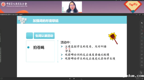 北京语言大学莫丹副教授带来的《初级阶段词汇教学方法与技巧》主题课程,着重分析了词汇教学的重要性和如何做到有效教学,并向老师们展示了词汇教学环节课堂活动示例。