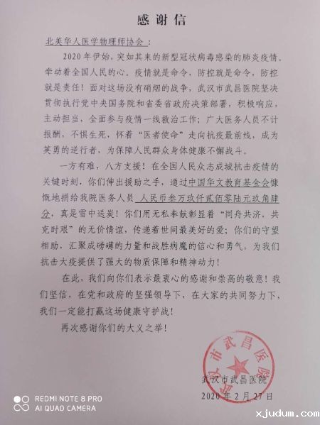 北美华人医学物理师协会发起的募捐共筹得善款19920美元(合计人民币139206.94元),日前,该笔捐款已拨付武汉市武昌医院和金银潭医院。