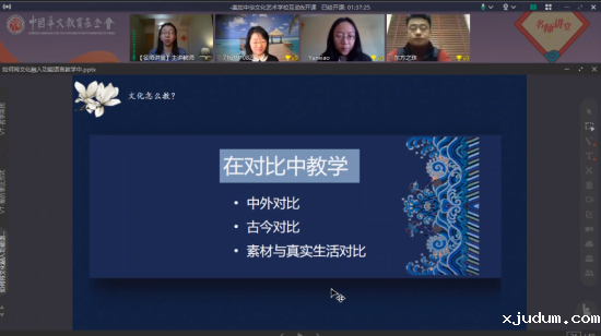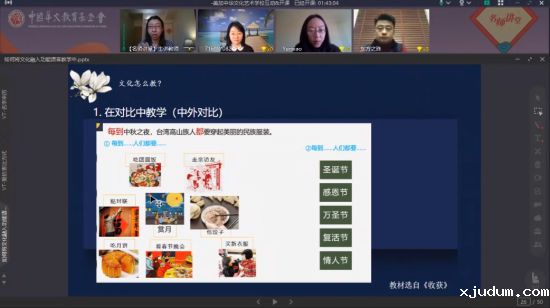 本次开课仪式互动课,是由国家开放大学的李岩老师带来的《如何将文化融入功能性汉语教学中》。李岩老师从为什么教文化、文化教什么、文化怎么教等方面进行阐述,并以《中文》教材为例,为老师们展示了语言课堂与文化教学相结合的教学实例。