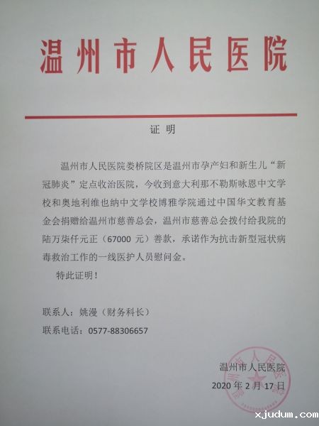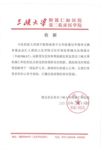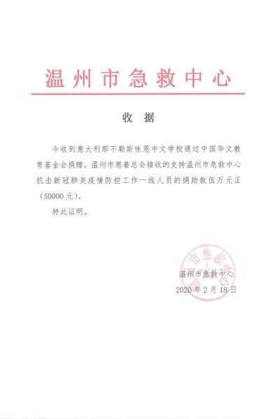意大利那不勒斯咏恩中文学校和奥地利维也纳中文学校博雅学院联手向浙江温州急救中心、温州市人民医院和湖北省宜昌市仁和医院资助182708.57元,用于抗击新冠疫情。