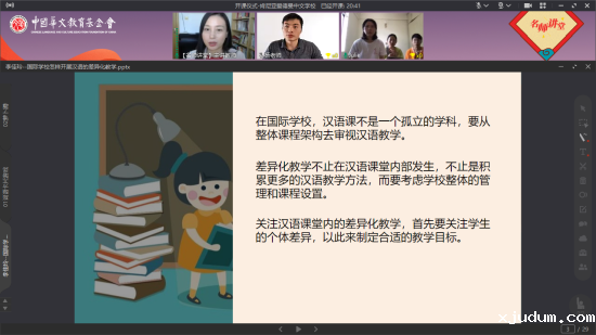 本次开课仪式互动课,是由北京芳草地国际学校的李佳玲老师带来的《国际学校怎样开展汉语的差异化教学》。李佳玲老师解释了什么是差异化教学以及差异化教学(个性化教学)的关键,并通过实际的教学案例,讲解了在教学中如何使用不同的教学策略,达到最终的教学目标。